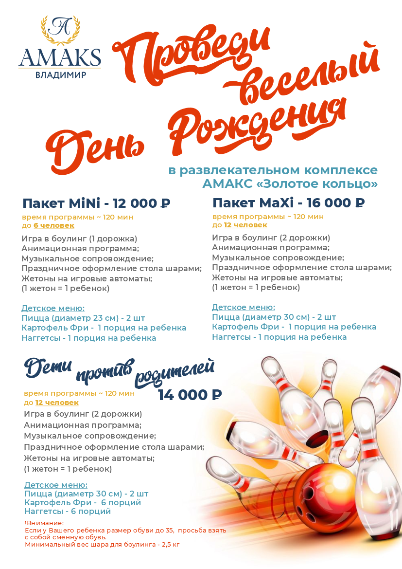 Профессиональная команда АМАКС «Золотое кольцо» рада предложить одно из лучших и выгодных мест для проведения детских дней рождений во Владимире.